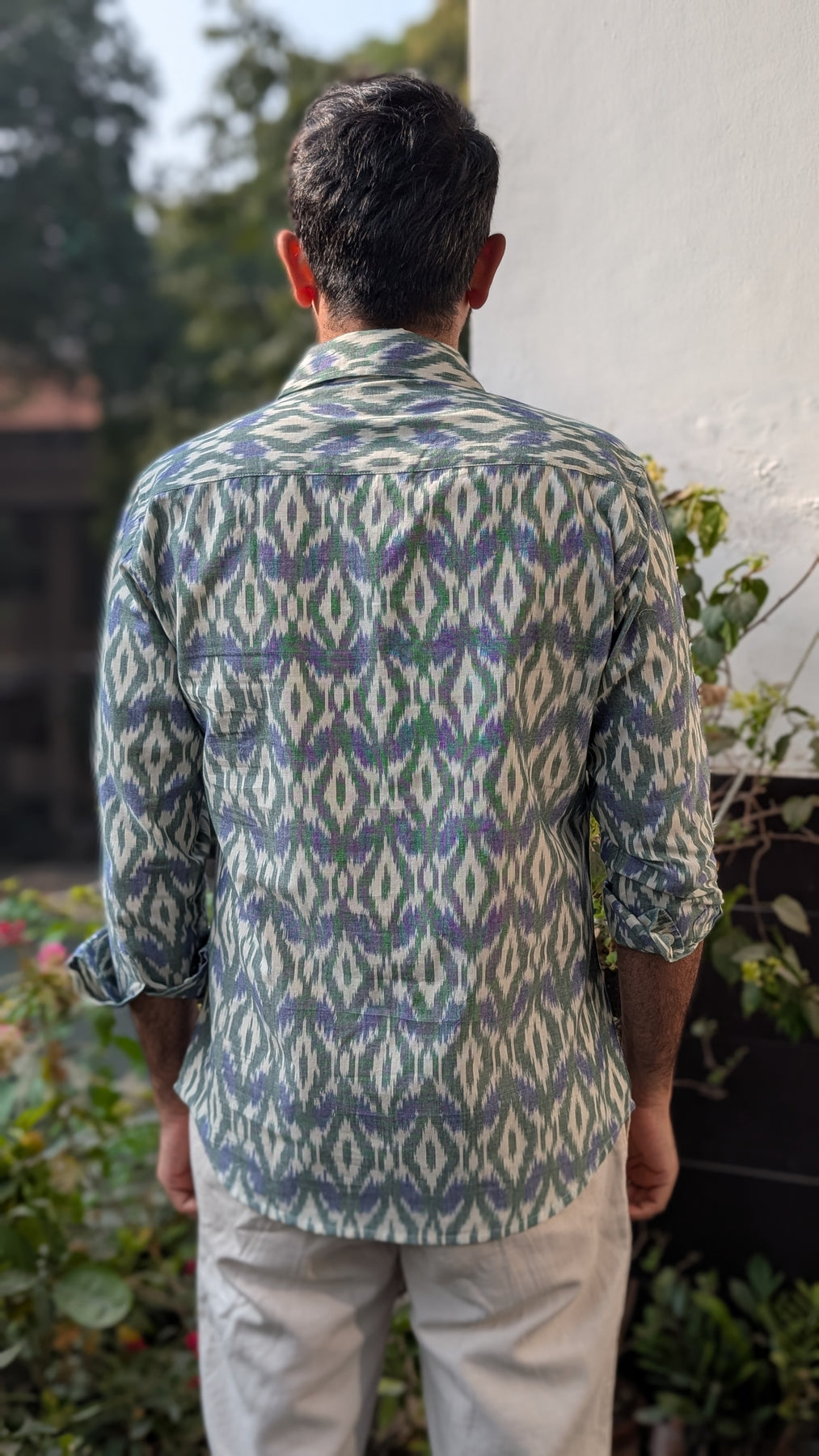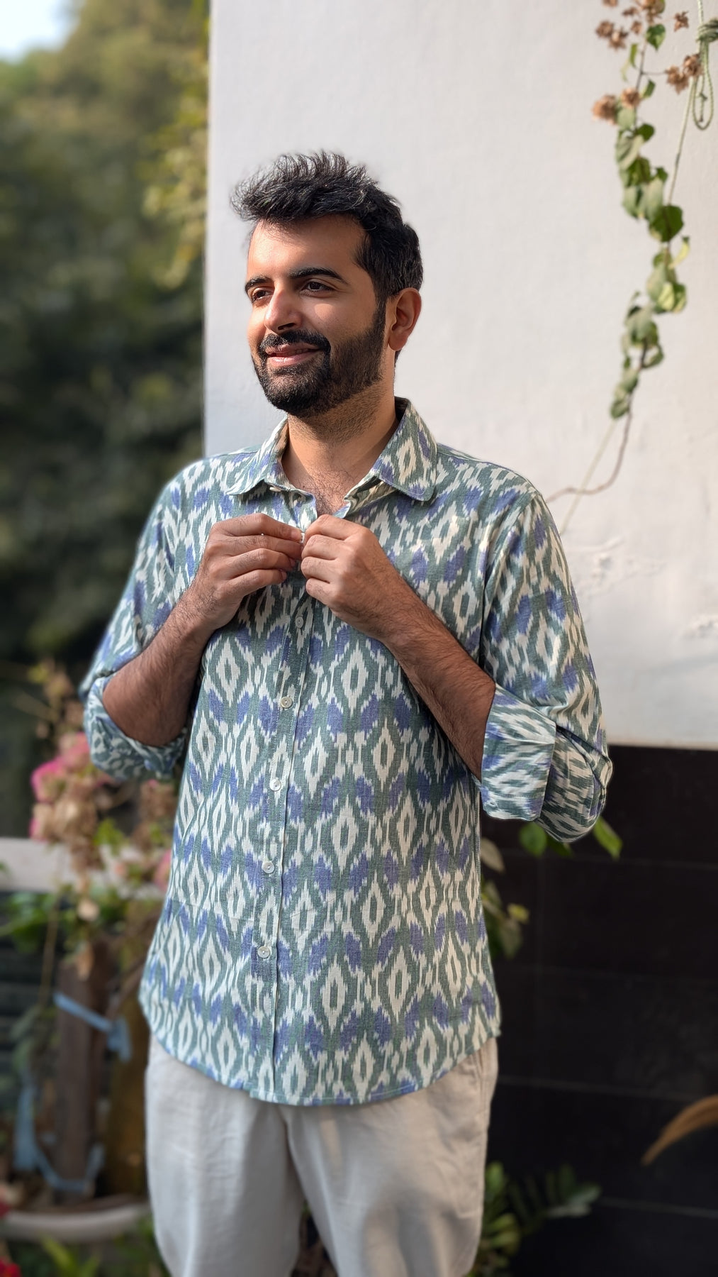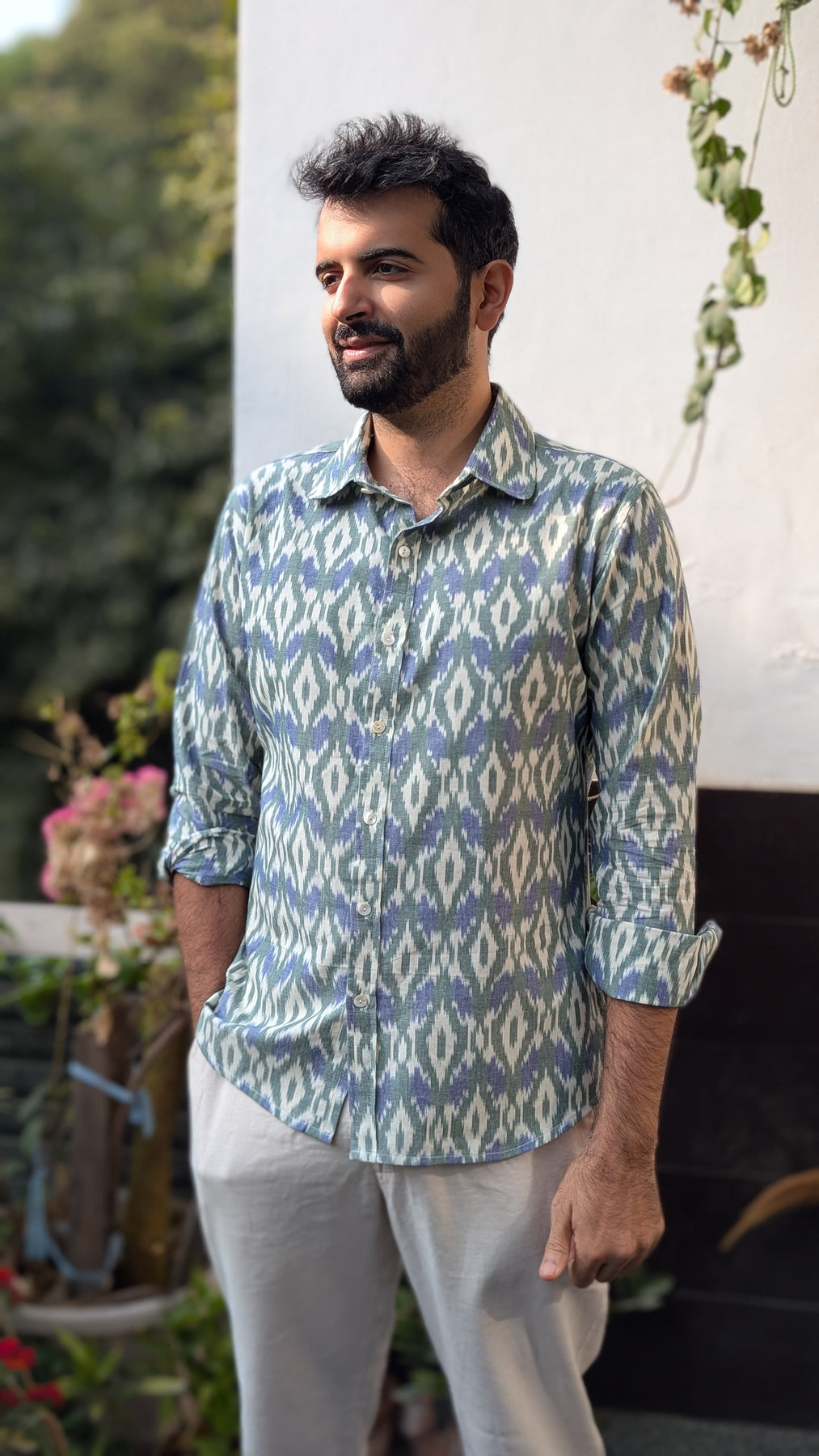 Crafted in breathable cotton ikat, the Junoon shirt features a soft grey base with light purple detailing woven into the fabric. Designed with full sleeves and a classic three-point collar, it has a structured yet easy silhouette that works across seasons. The cotton fabric feels light on the skin and softens with wear, making it comfortable for long days. Style it buttoned up with tailored trousers for work, or wear it open over a vest or tee for a more relaxed look. Easy to dress up or down, this is a versatile shirt you’ll reach for often.