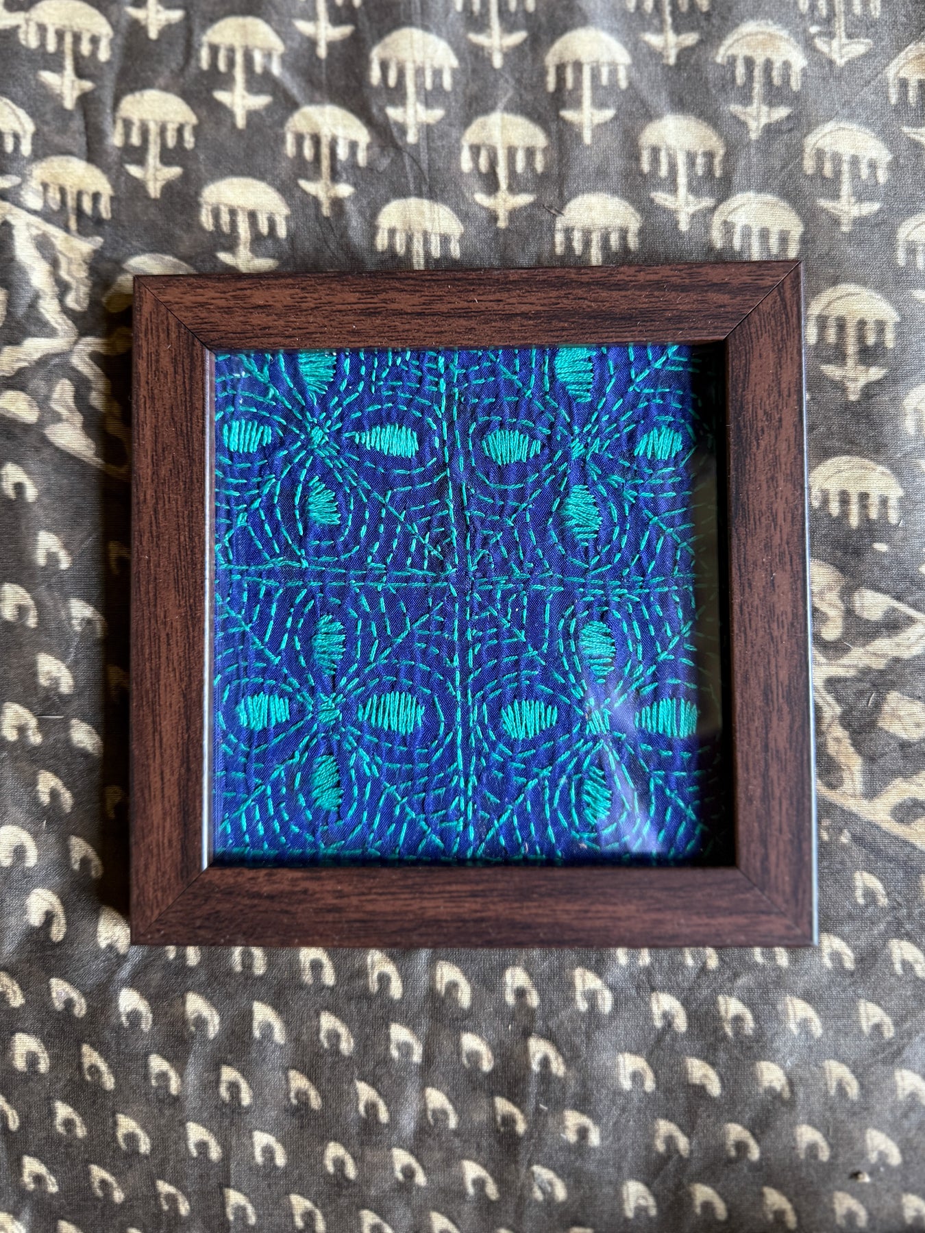These kantha coasters are hand-stitched and neatly framed with engineered wood an acrylic panel. It's a perfect gift and brightens up your chai / coffee time.