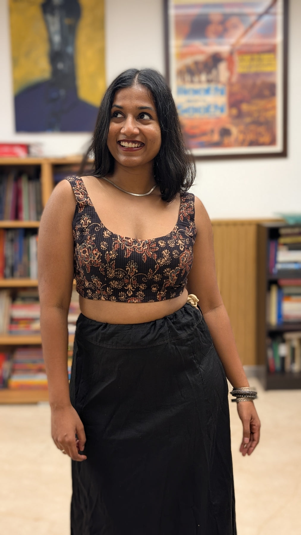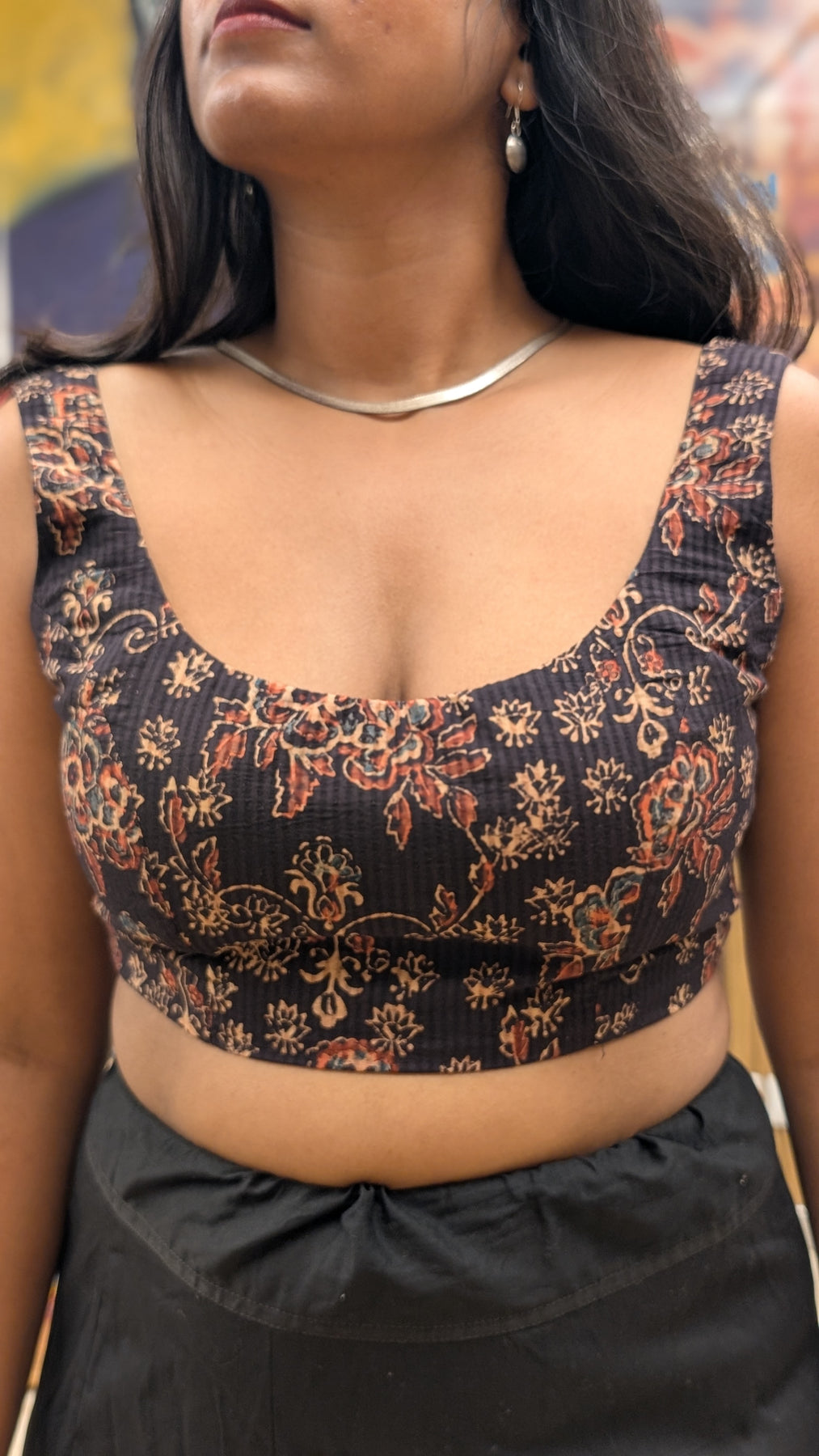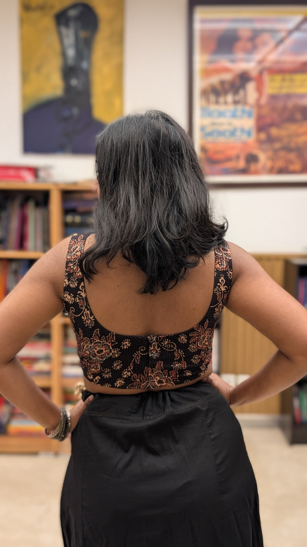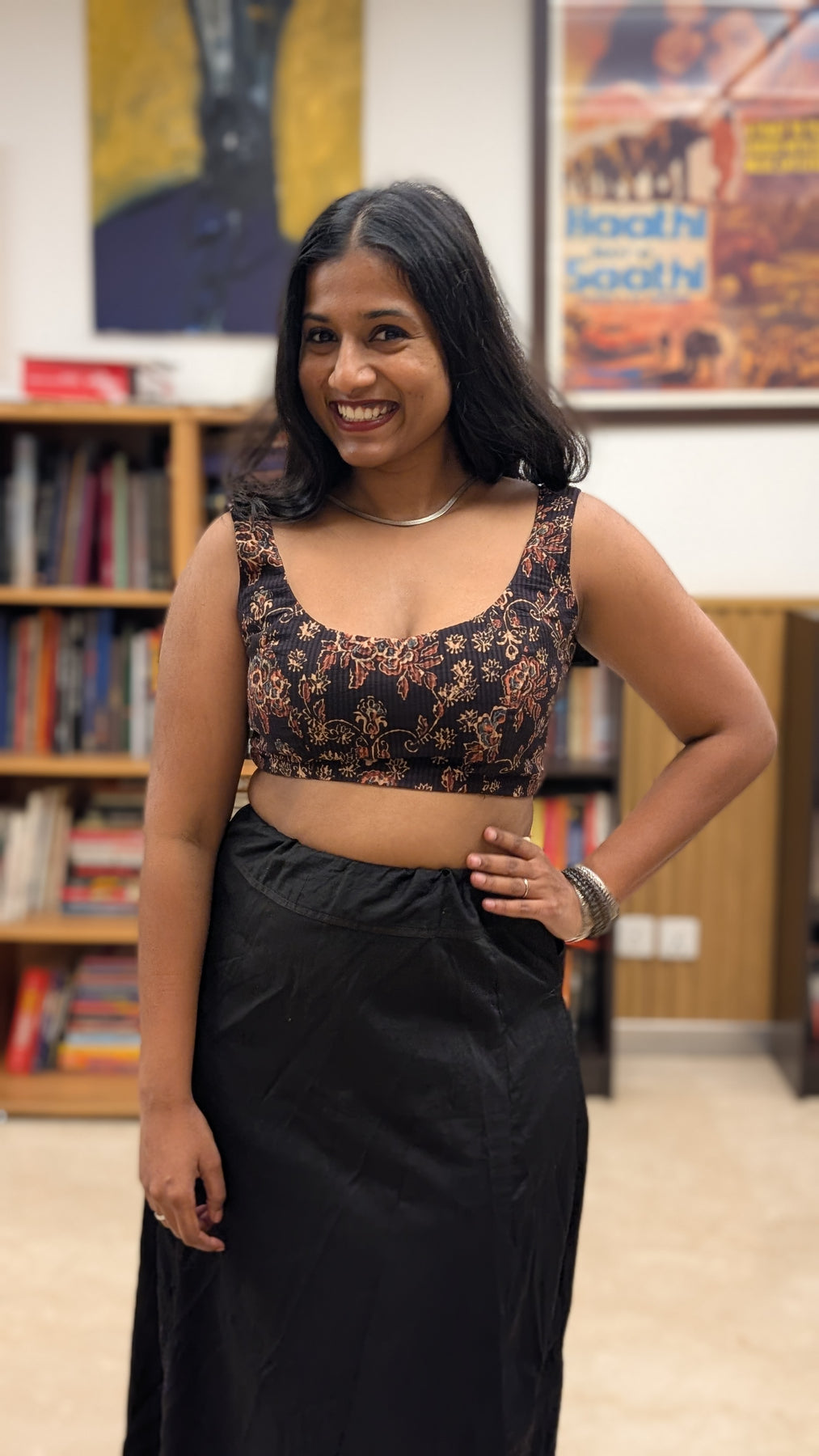 Designed with a wide scoop neck that works with almost any drape, the Sushmita blouse is made in lightly textured cotton that feels breathable yet holds shape. The black printed fabric makes it easy to match with solids or handloom sarees. We've included a back-hook closure for a smooth, polished finish.